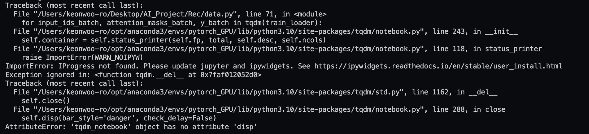 NLP 프로젝트를 진행하며 다른사람들의 코드를 참조하는데 이와 같은 에러가 발생하였다.
