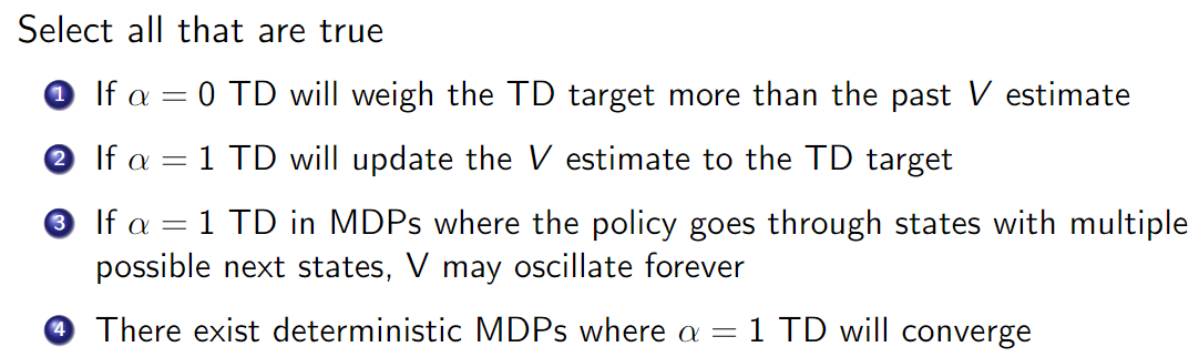 정답은 2,3,4 이다. 1번은 수식을 보면 알겠지만 초기 policy에서 update되지 않는다. \(\alpha=1\)이라는 의미는 직전의 action만 고려한다는 뜻이다. 따라서 2번은 참이고 3번도 직전의 행동만 고려하므로 여러 가능한 모든 state 를 방문할 때마다 해당 state에 최적화되어 진동하게 된다. 4번은 직전 action만 고려하는 환경에서는 올바른 추정이므로 참이다.