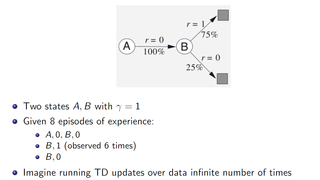 AB example에 대한 MC와 TD의 결과를 비교해보자. MC 의 경우는 최종적으로 얻은 return을 업데이트하기 때문에 V(A)=0이라는 결과가 나왔지만 TD는 temporal하게 update하기 때문에 V(A)=3/4라는 추정을 얻었다. 이는 DP with certainty equivalence와 동일하다고도 볼 수 있고 markov property가 적용되는 모델이기 때문에 MC보다 더 좋은 결과를 보인다.