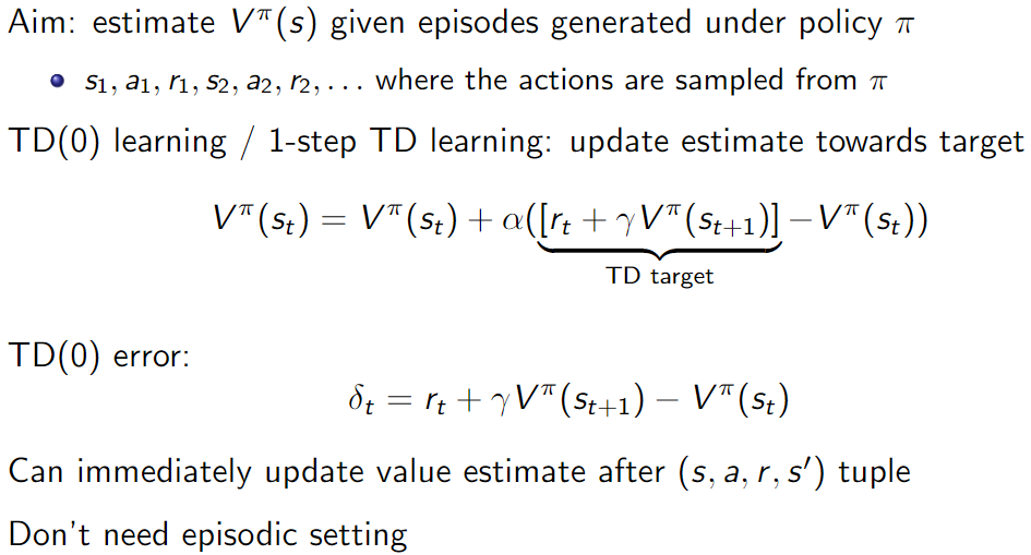 - Immediately updates estimate of V after each (s,a,r,s') tuple