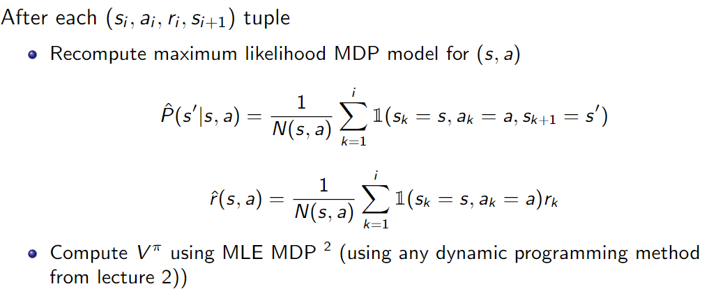 True model에서 얻어진 MLE (maximum likelihood) 또한 True이다. transition probability를 모르는 상황에서 경험한 episode를 바탕으로 MLE를 추정할 수 있고 이는 True model에 근사한 확률값을 가질 수 있다. 즉 경험으로부터 임의의 MLE를 통해 MDP를 추정하고 model-based method를 사용하는 것이다.