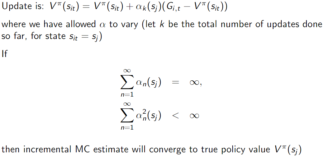 중복 횟수가 충분히 큰 수가 된다면 이후의 return값은 0에 가까운 영향을 주게 된다. 하지만 실제로 policy가 update하는 과정에서 후반부의 return값이 중요한 경우가 있을 수 있기 때문에 충분히 작은 고정 상수 \(\alpha\)를 사용해 이 문제를 완화한다.