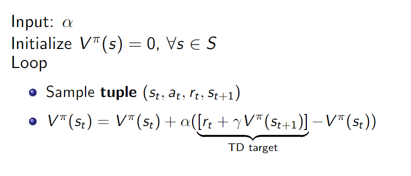 - Immediately updates estimate of V after each (s,a,r,s') tuple