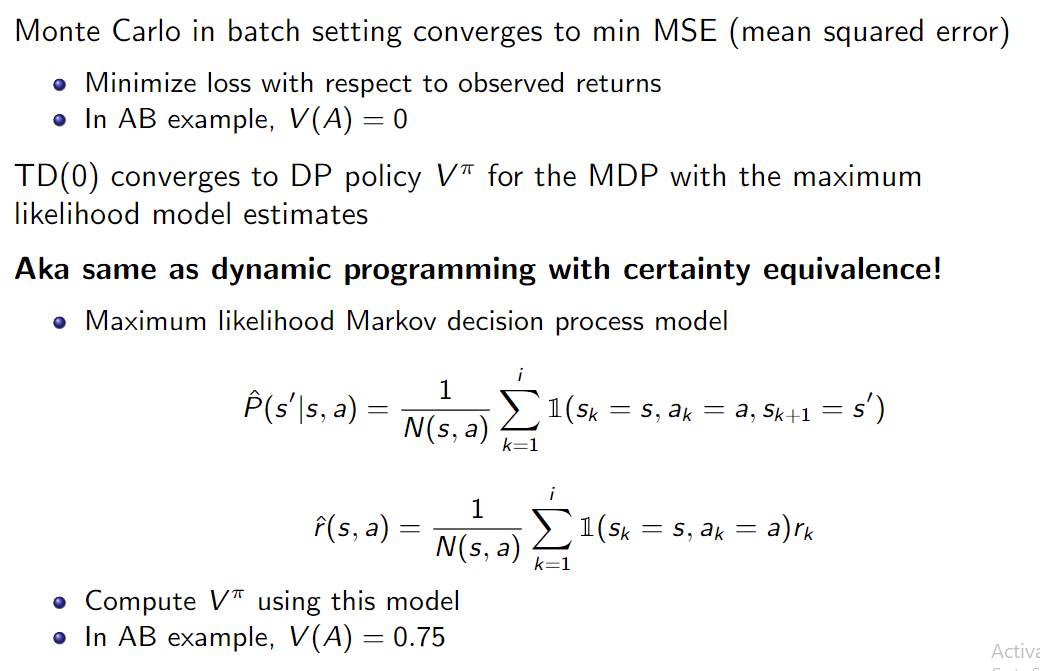 AB example에 대한 MC와 TD의 결과를 비교해보자. MC 의 경우는 최종적으로 얻은 return을 업데이트하기 때문에 V(A)=0이라는 결과가 나왔지만 TD는 temporal하게 update하기 때문에 V(A)=3/4라는 추정을 얻었다. 이는 DP with certainty equivalence와 동일하다고도 볼 수 있고 markov property가 적용되는 모델이기 때문에 MC보다 더 좋은 결과를 보인다.