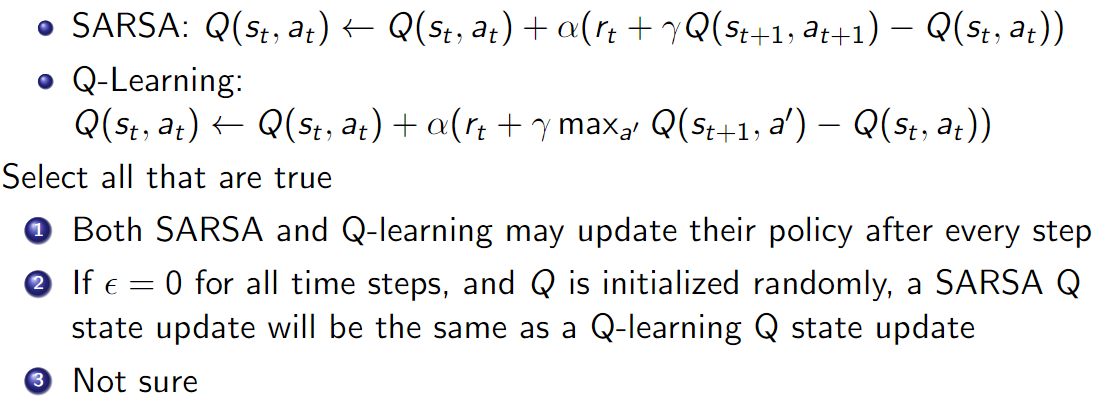 1번과 2번 모두 정답이다. 1번은 알고리즘 정의를 살펴보면 쉽게 알 수 있다. 2번은 \(\epsilon=0\)이면 어떤 action이든 max가 되도록 하는 action을 취하게 되므로 Q-Learning은 on-policy 가 되고 SARSA와 같은 Q값을 update하게 된다.