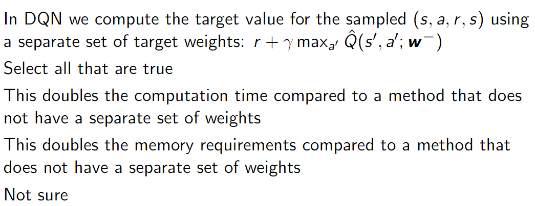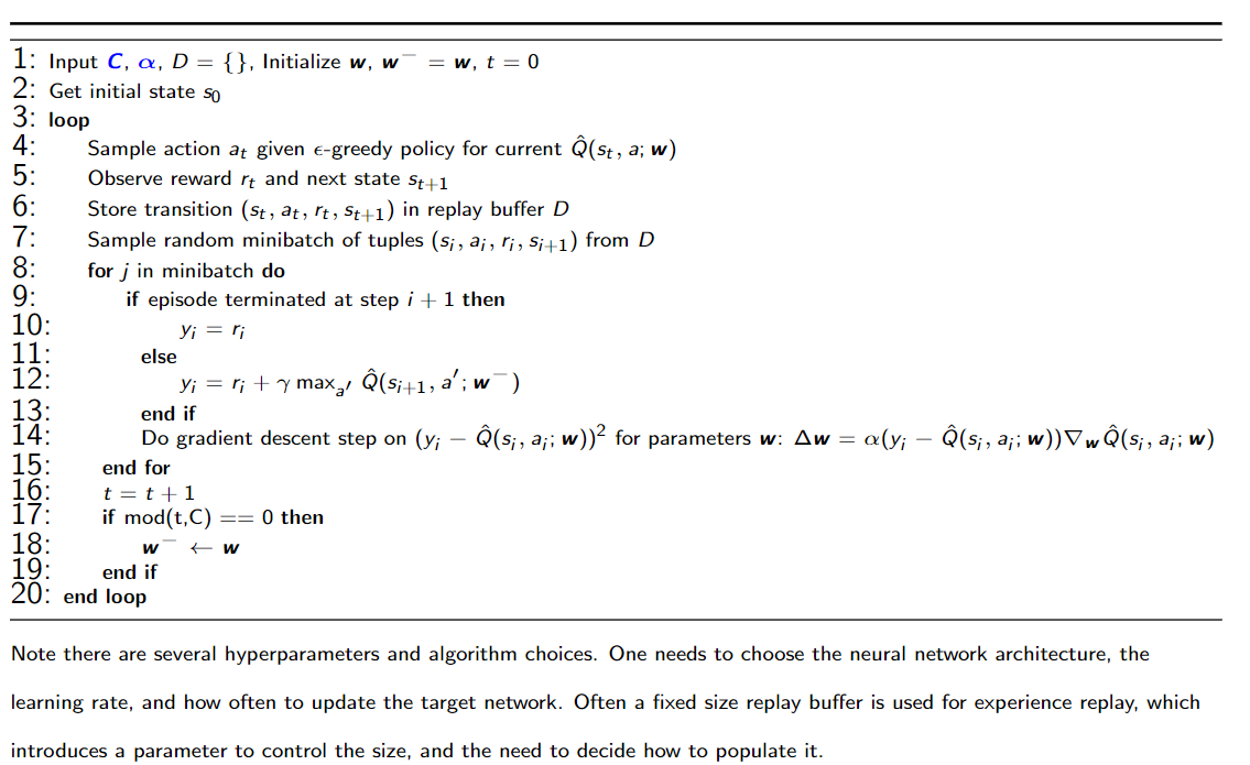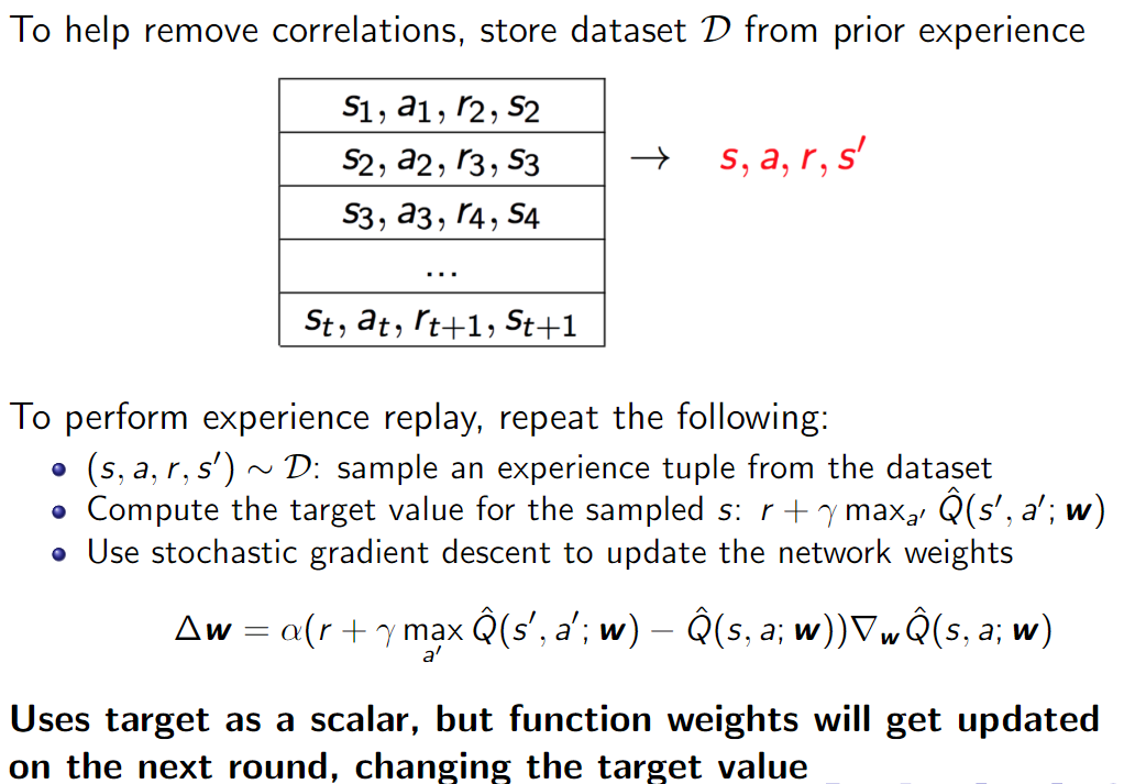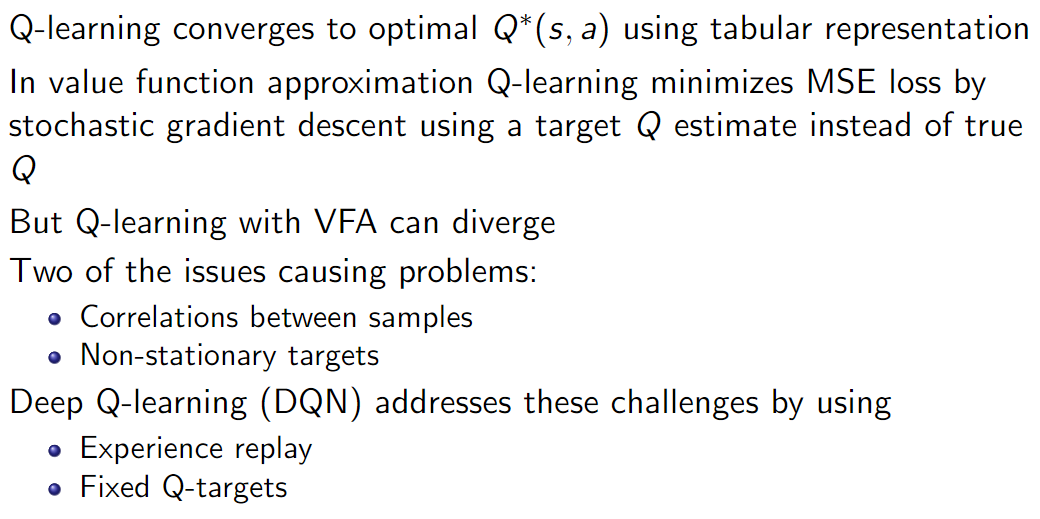 - Non-stationary targets 이란 DQN은 off-policy에 VFA를 사용하는데 target value가 update마다 수정되면서 고정된 target value가 아닌 변화하는 target value를 추정해야하기 때문에 학습에 어렵다는 의미이다.