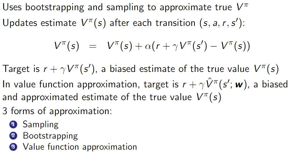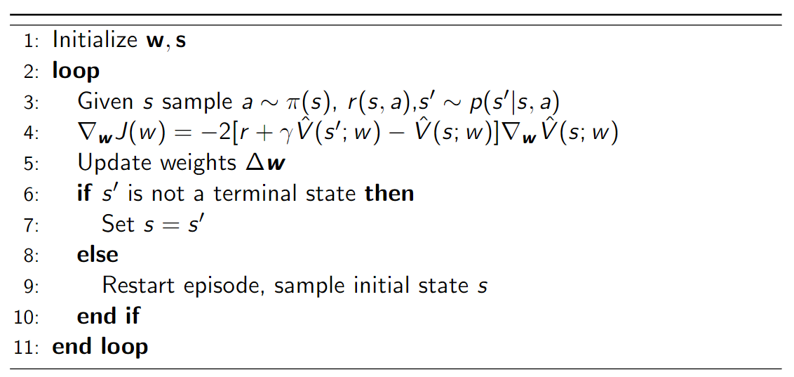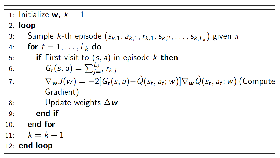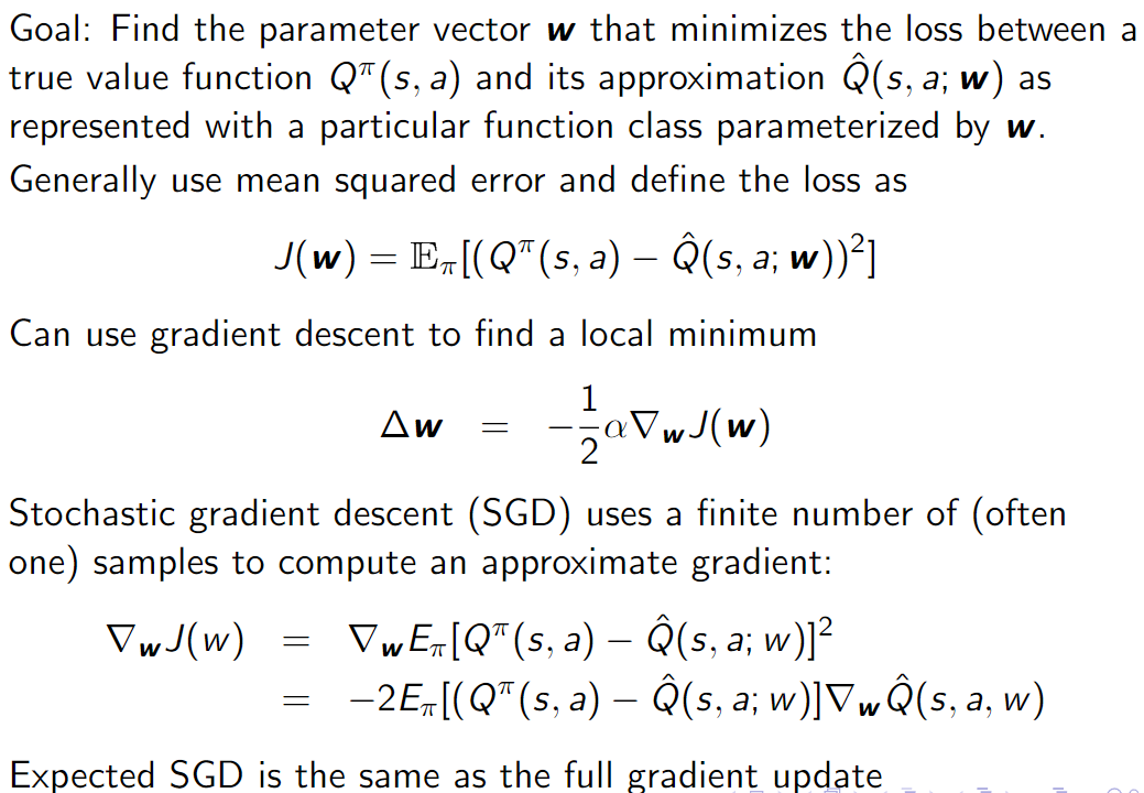 Value function approximation 방식은 다양한 방법론에 적용가능하다. MC인 경우 True value를 return 으로 TD를 사용할 경우 bellman equation을 사용한다.