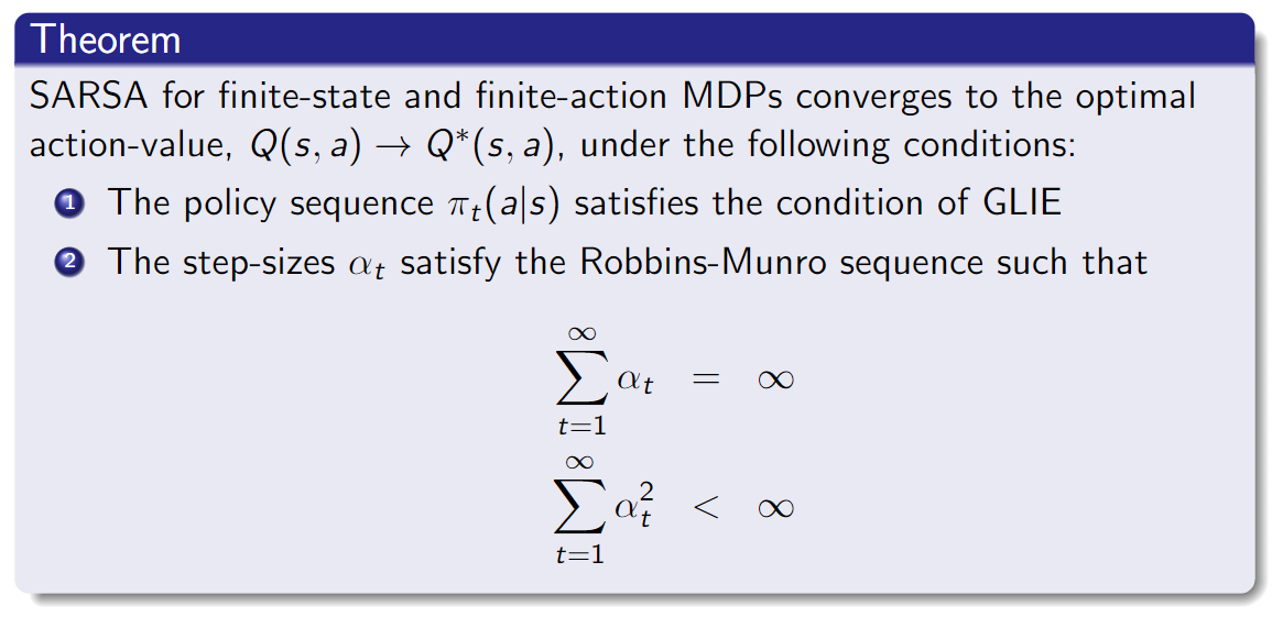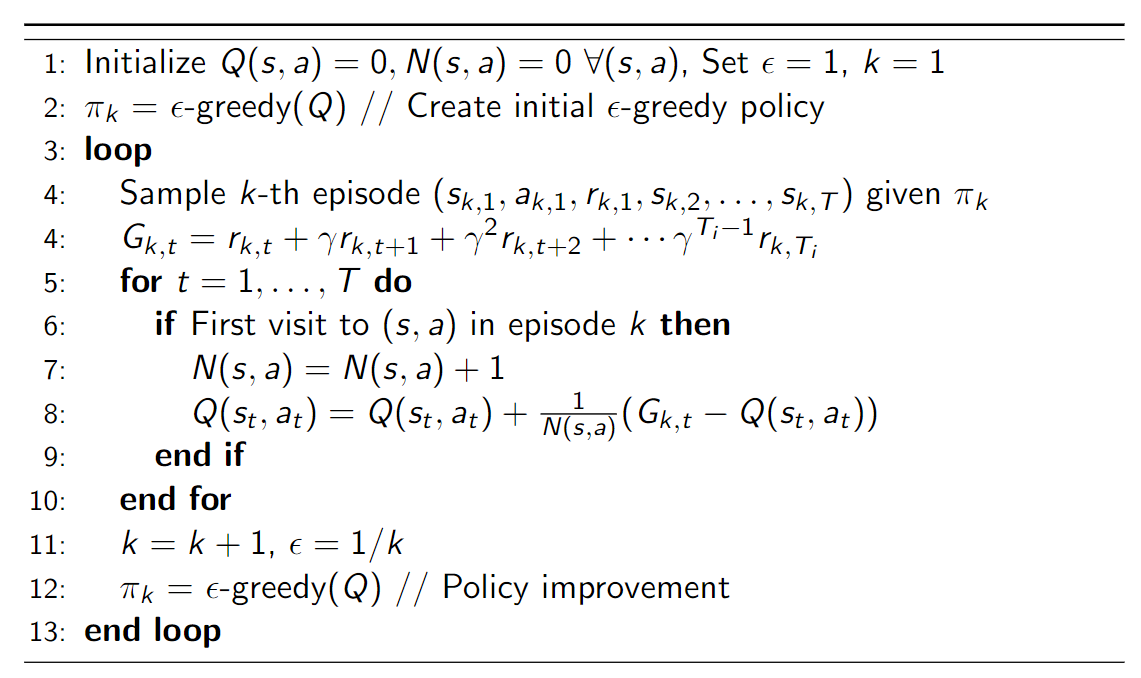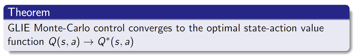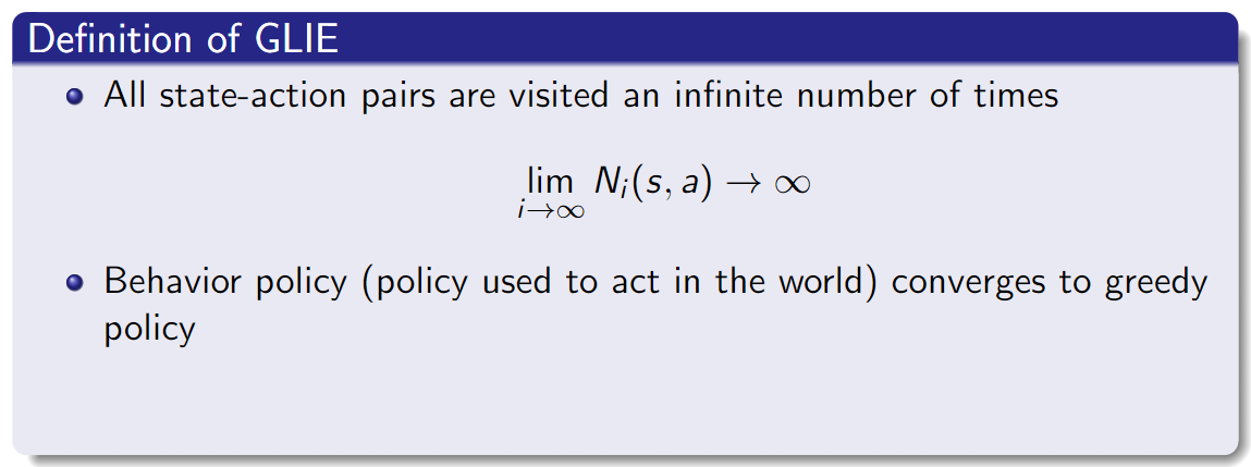 A simple GLIE strategy is \(\epsilon\)-greedy where \(\epsilon\) is reduced to 0 with the following rate: \(\epsilon_i = 1/i\)