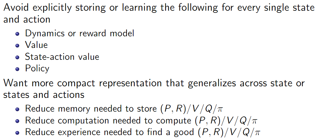 1강부터 살펴본 내용은 model-based, model-free 를 table data에 적용하는 방법론들이였다. state나 action space가 더이상 finite하지 않고 countable하거나 uncountable하다면 메모리가 너무 커져 너무 많은 시간이 소요되거나 학습 자체가 안될 것이다. 세상은 continuous space인 경우가 많으므로 일반화하기 위해서 고려해야 할 사항들이 있다.