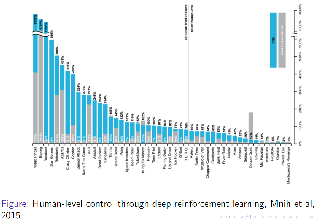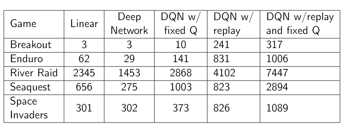 DNN보다 단순 Linear모델이 성능이 높은것을 보아 DNN만으로 해결할 수 없는 문제라는걸 보여준다. DQN이 Linear, DNN보다 좋은 성능을 보여주고 특히 experience replay(buffer)를 사용한게 큰 성능 향상을 일으켰다.