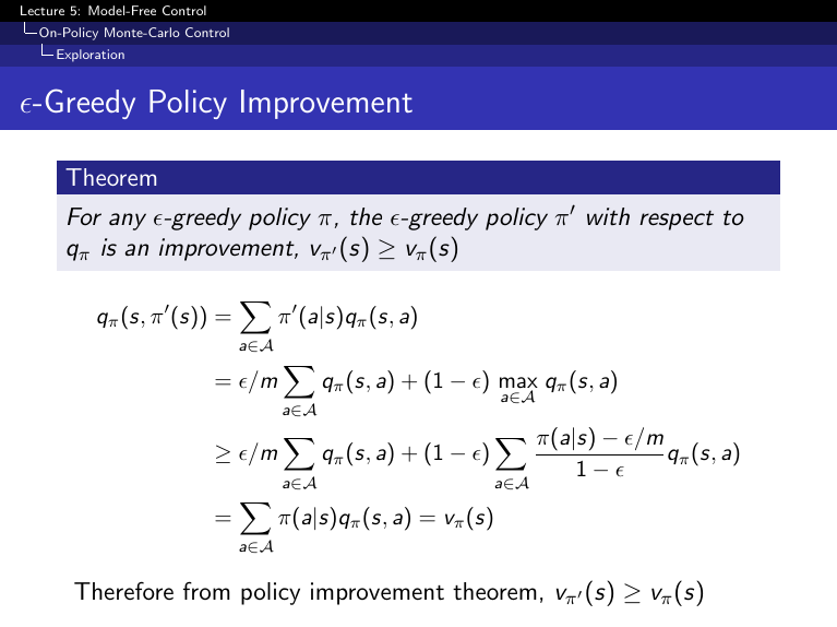 \(\epsilon\)-greedy policy는 policy improvement theorem을 만족한다. \(\epsilon\)만큼 다른 action에 확률을 분배해주어 deterministic이 아닌 stocastic으로 action을 선택한다. 이는 exploration을 가능하게해 더 좋은 action을 학습할 수 있는 기회를 얻게 된다.