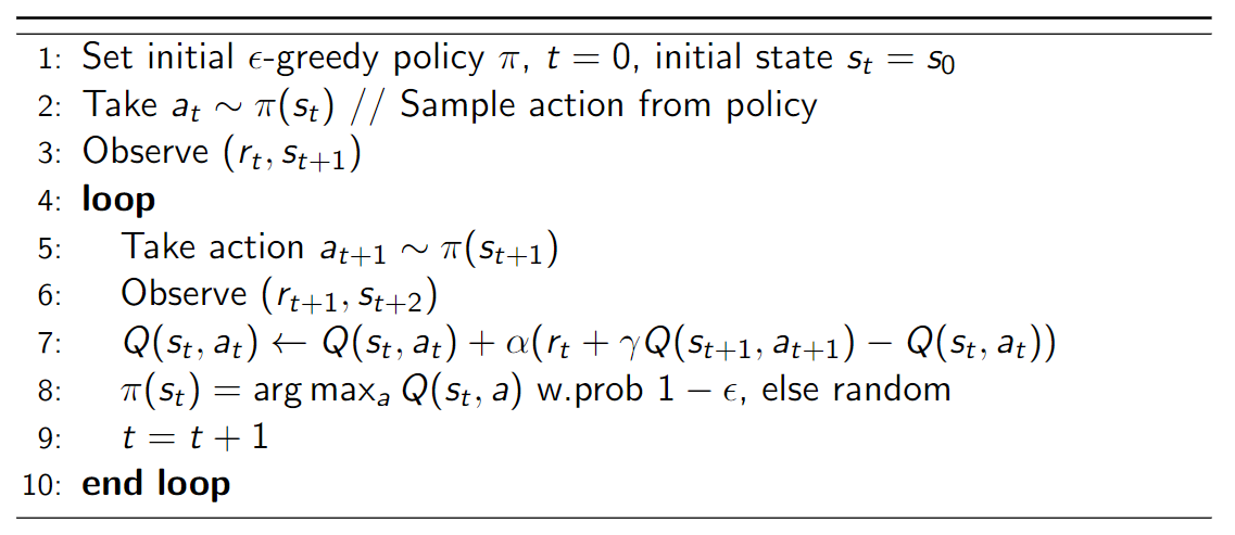 대표적인 on-policy TD method인 SARSA 의 수식이다. SARSA는 state-action-reward-state-action에 대해 update하는 방식으로 앞글자만 따서 만든 표현이다. 8번 줄을 보면 \(\epsilon\)-greedy 또한 적용하였다.