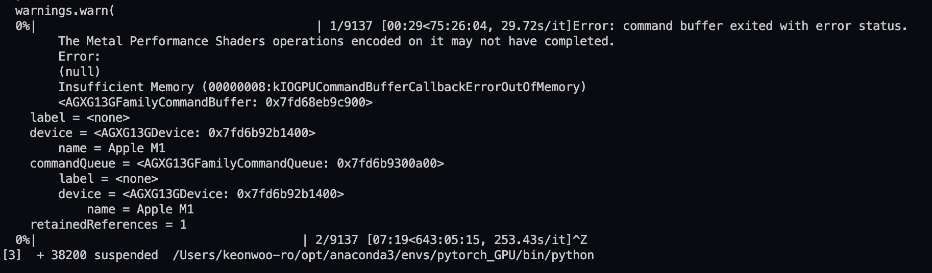 해석하자면 '에러 상태로 명령 버퍼가 종료되었고 "Metal Performance Shaders"연산이 완료되지 않았을 수 있다.' 라는 내용이다. Metal Performance Shaders는 apple developer[link] 페이지를 보면 Pytorch의 GPU 학습을 위한 그래픽 API이다.