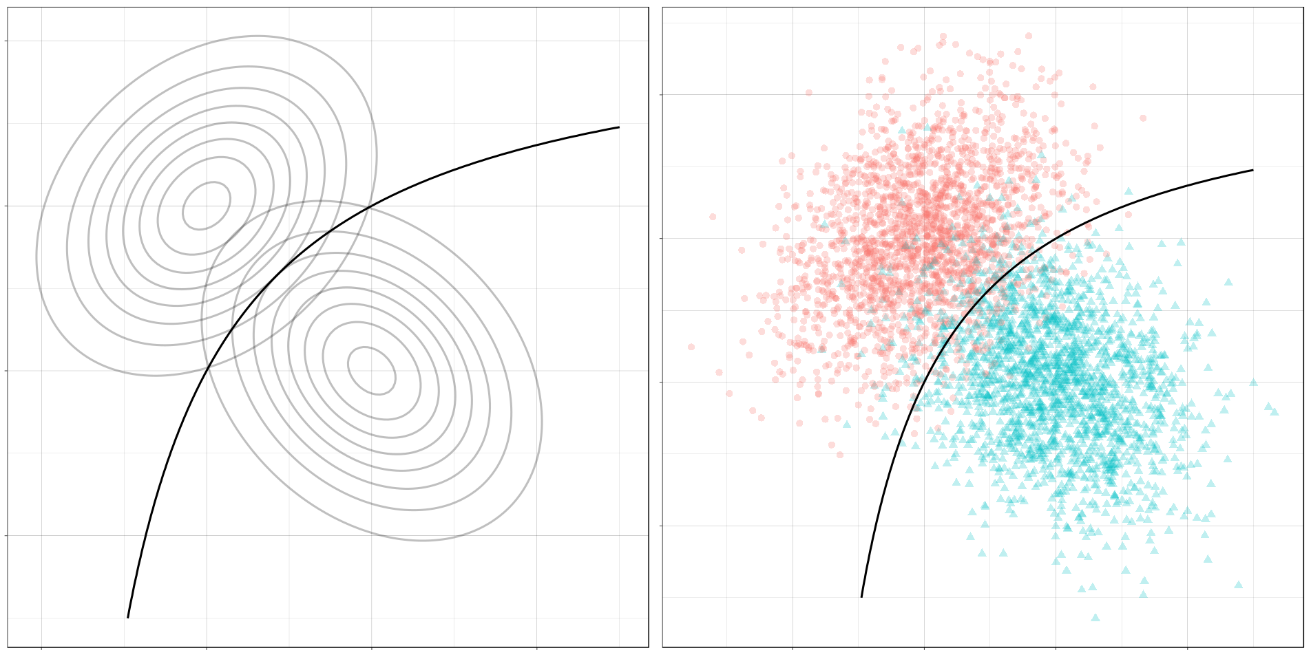 - Why? GDA는 이상치를 포함하여 확률 분포를 추정하고 결정경계를 결정한다면 LR은 loss식에 이상치가 있다라더라도 sigmoid를 통해 덜 민감하게 반영되기 때문에 강인하다고 볼 수 있다