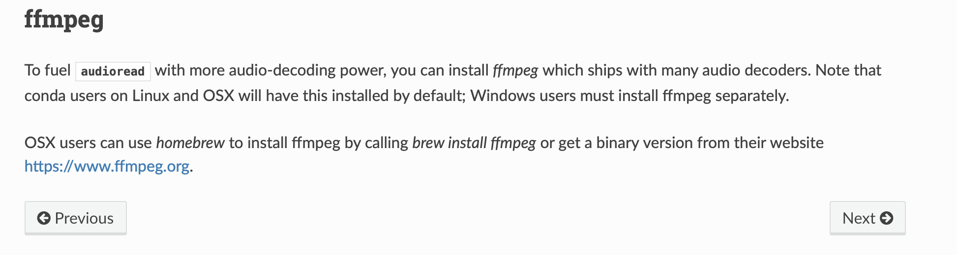이유는 문서를 읽어보면 OS운영체제 사용자들은 ffmpeg가 default로 설치되어 있고 windows 사용자들은 설치가 필요하다고 나와있다. 기본 macOS가 아닌 가상환경을 만들어 사용하니 ffmpeg가 설치되지 않은 것으로 보인다.