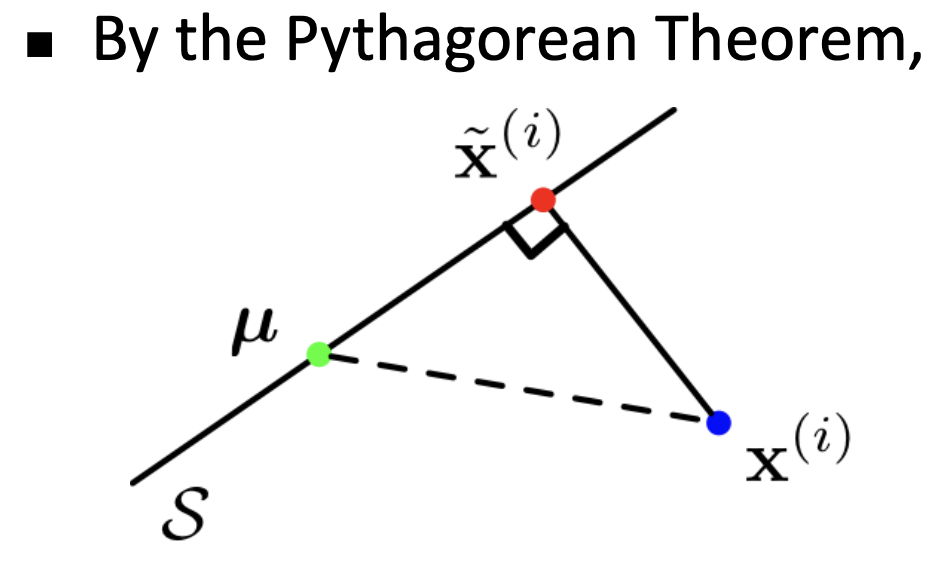 \(min\frac{1}{N}\sum_{i=1}^N||X^{(i)}-\hat{X}^{(i)}||^2 = \frac{1}{N}\sum_{i=1}^N (||X^{(i)}-\mu||^2-||\hat{X}^{(i)}-\mu||^2)\)