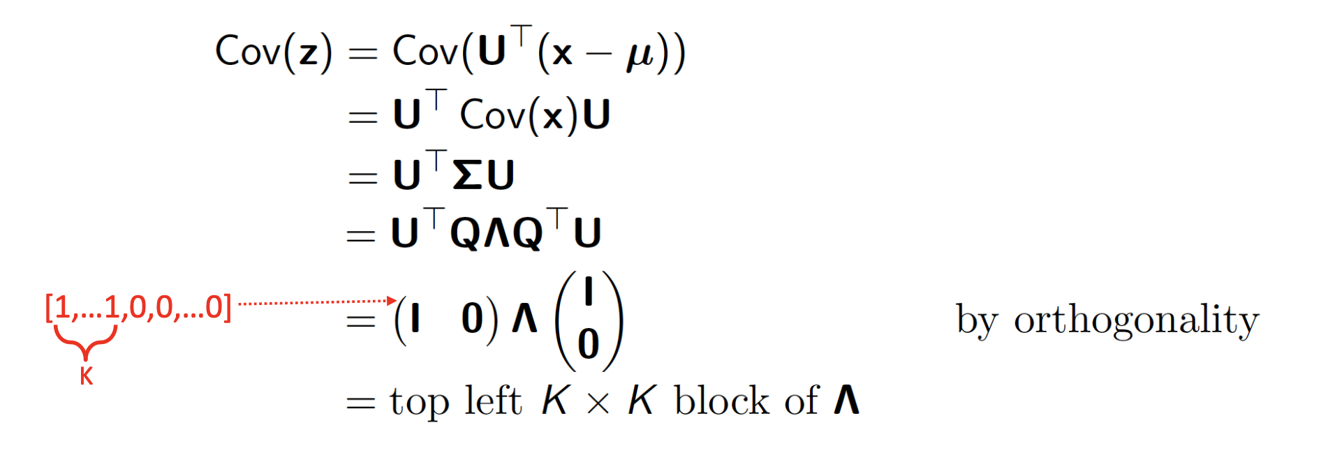 \(\hat{X} = \mu + \sum_{k=1}^K z_k u_k\), also \(z_k = u_k^T(x-\mu)\)