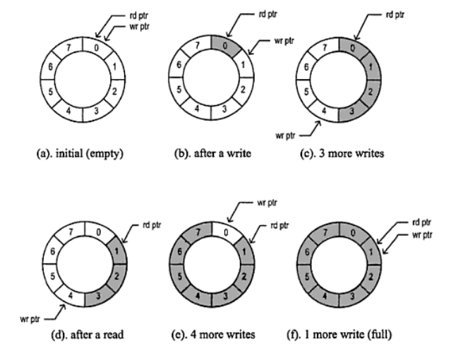 (a). 와 (f).를 비교했을때 front, rear pointer는 같지만 상태는 정반대인 것을 확인 할 수 있다.
