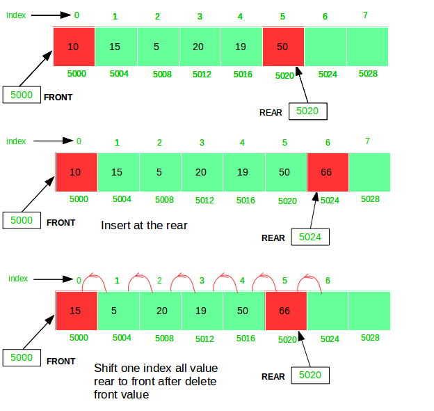 여기서 문제점은 dequeue() 연산시 자리를 옮기는 과정에서 오버헤드가 발생한다.