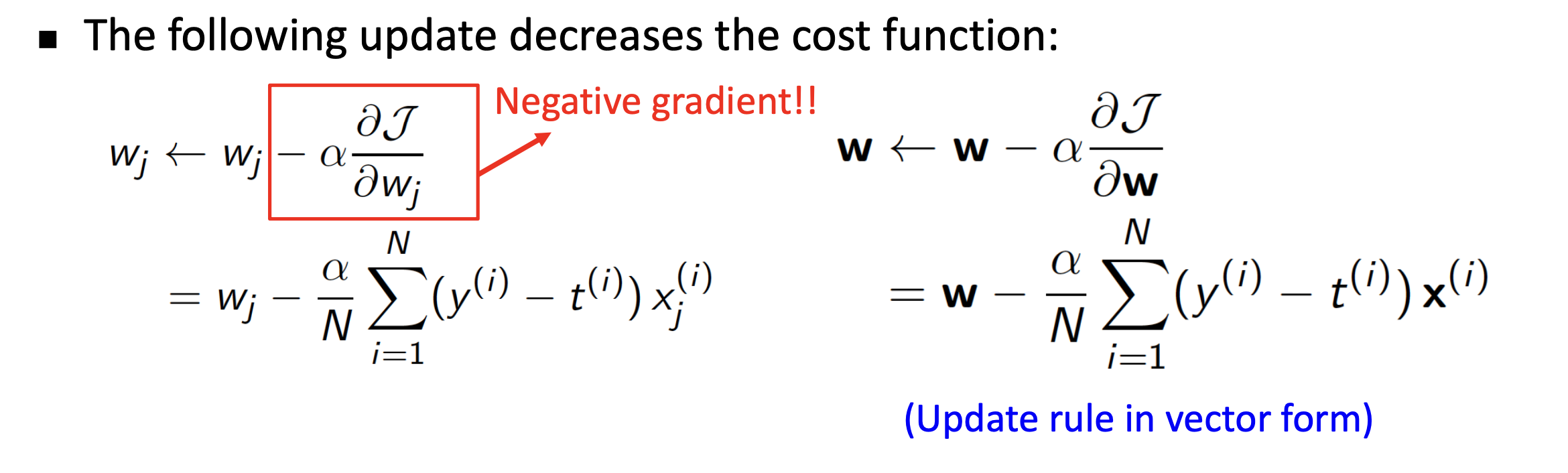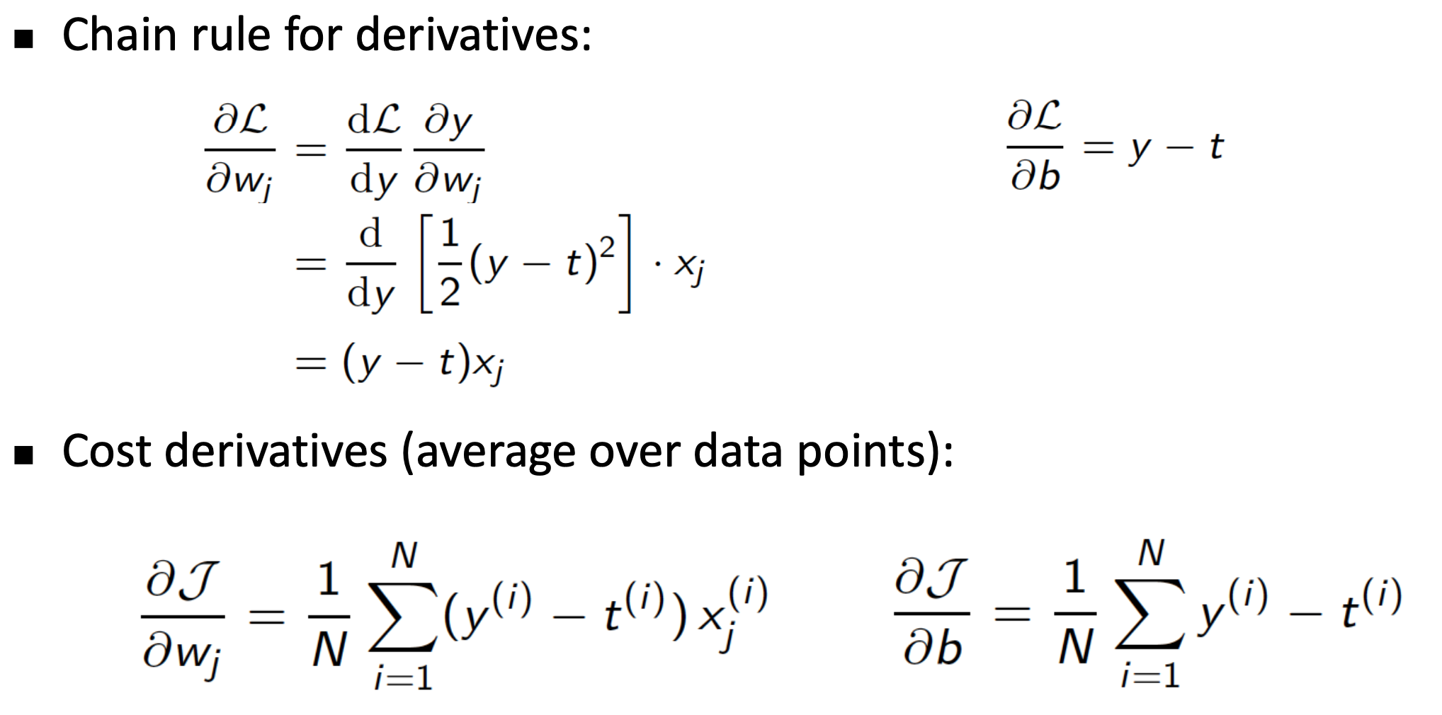 \(J(w,b) = \frac{1}{2N}\sum_{i=1}^{N}(y^{(i)}-t^{(i)})^2 = \frac{1}{2N}\sum_{i=1}^{N}(wx^{(i)}+b-t^{(i)})^2\) - Suppose that multi-dimensional inputs \(x = \left\{x_{1}, x_{2}, ~, x_{D} \right\} \), Linear model \(y = \sum_{j}w_{j}x_{j}+b\)