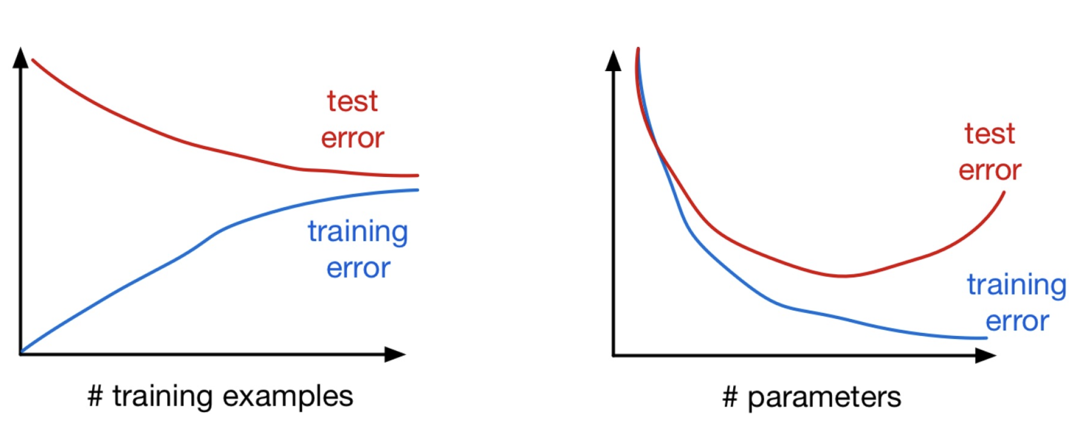 훈련데이터 개수와 변수 개수에 따른 error값 그래프를 나타낸 것이다. 왼쪽 같은 경우 데이터가 많으면 많을수록 좋다는 것을 의미하고 오른쪽은 매개변수가 너무 많으면 과적합 위험이 있음을 나타낸다.