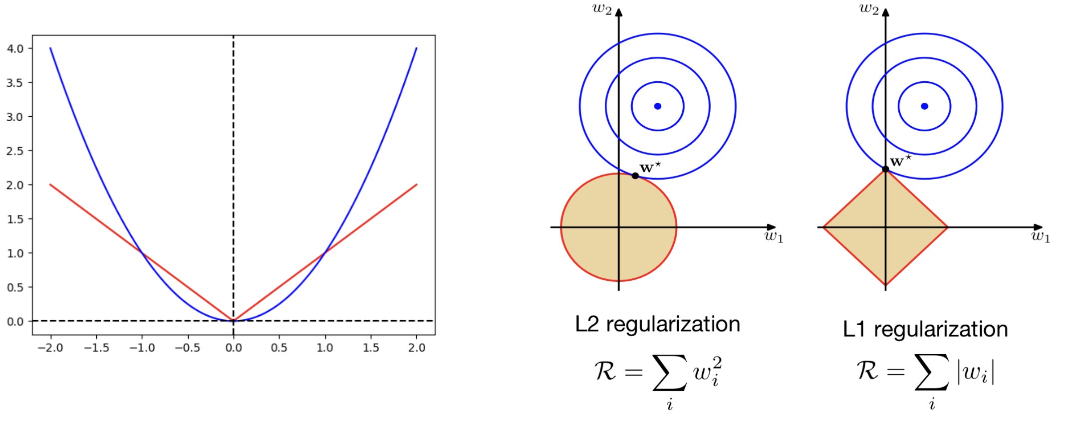 - 오른쪽 그래프를 보면 L1-norm을 사용할때 얻는 최적 가중치 w는 각 꼭짓점에서 만날 확률이 L2-norm보다 높다 따라서 가중치에서 필요한 feature만 추출하는 값만 남고 나머지는 0이 된다 (희소행렬, sparse matrix)