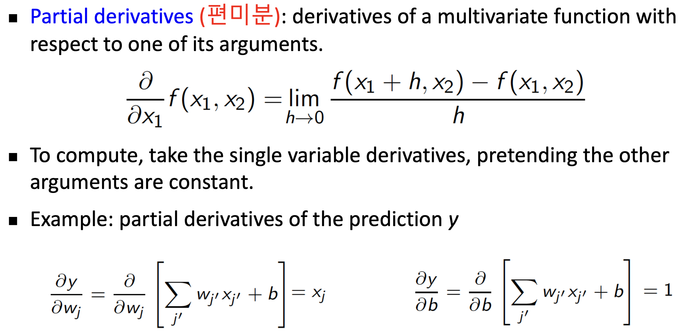 위 결과에 의해 모든 편미분 값이 0일 때가 최소이다. 만약 편미분 값이 0이 나올수 없는 형태이면 가중치를 갱신하여 다시 계산해야한다.