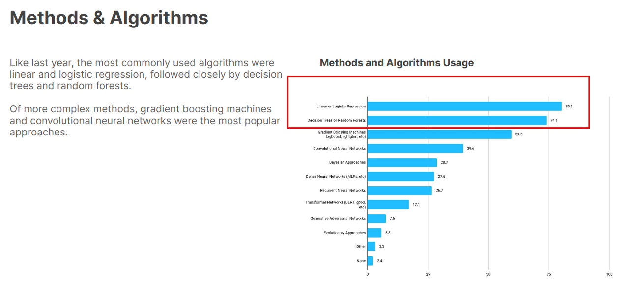 주로 사용하는 알고리즘 분포도를 확인하면 DL에 해당하는 CNN이 4번째고 1,2,3위는 ML의 모델 방식들 중 하나인 것을 확인 할 수있다.