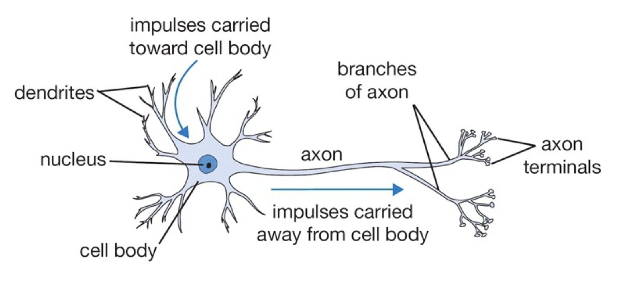 denderites(수상돌기)에서 입력을 전달 받아 axon(축삭돌기)를 통해 시냅스로 전달된다. 만약 시냅스의 신경전달물질이 임계점을 넘어가면 다른 뉴런으로 전달된다. 이 과정을 machine learning model들과 비교해보면 유사한 과정을 거치고 있다는 것을 알 수 있다.