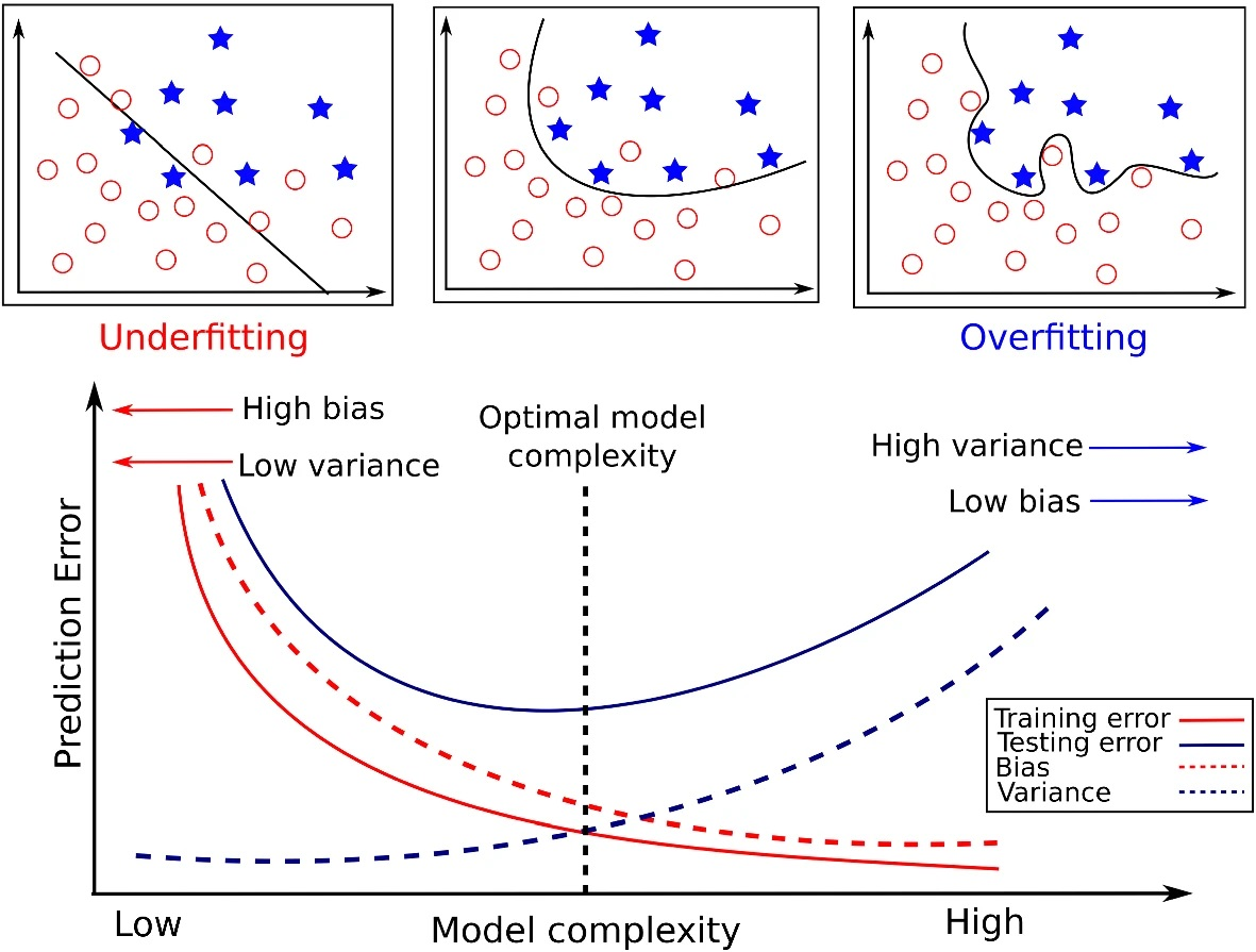 bias가 큰 경우에는 모델이 undeffitting 될 확률이 높고 vairance가 큰 경우에는 모델이 과적합 되기 쉽다. high bias와 high variance는 동시에 일어나기에 어려워 보이지만 예시와 같은 2D가 아닌 high dimension 데이터로 확장할 경우 흔히 일어날 수 있다.