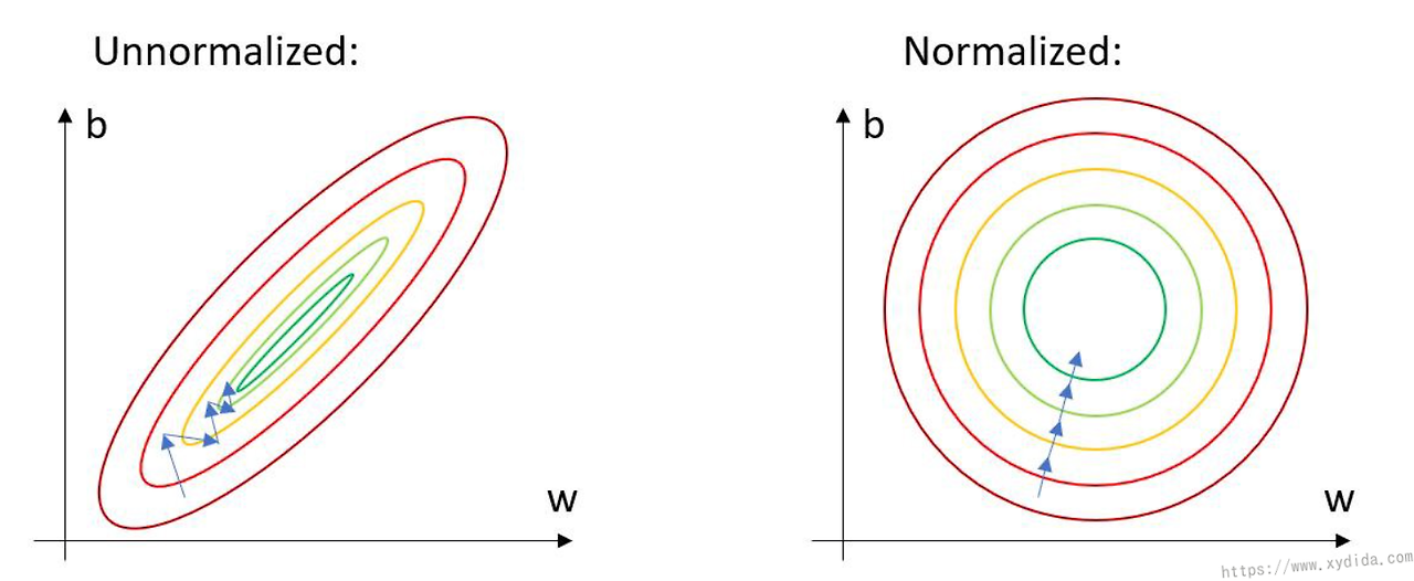 데이터를 정규화 하는것은 학습에 많은 도움이 된다. 정규화가 되지 않은 경우, 분산이 큰 축에서 최적화하는 과정에서 많은 step이 필요하게 된다.